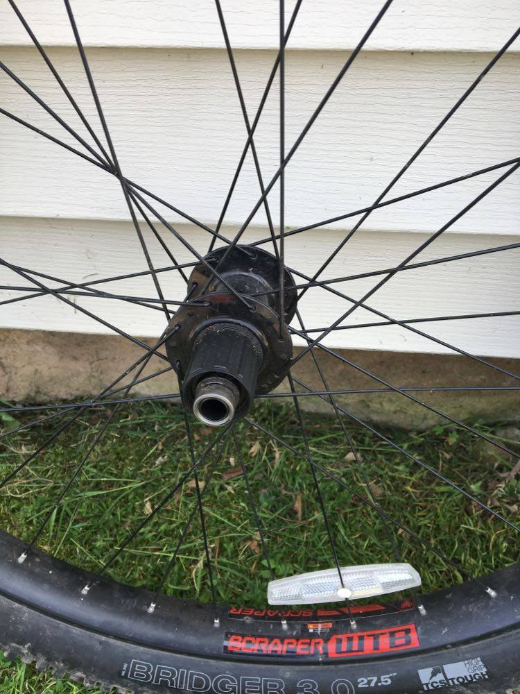 27.5+ wheelset! WTB Scraper 30 rims, front hub 15×110 thru axle, rear 15×148 thru axle. 6 bolt disc. WTB Bridger 3.0 tires are included, and already set up tubeless. Only $400.
