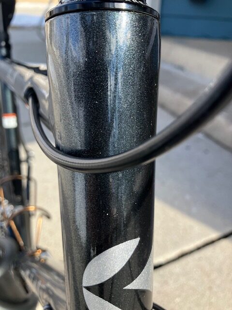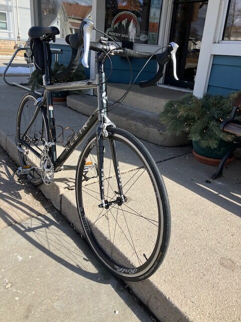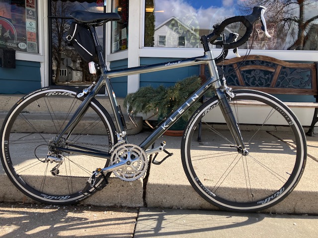 Klein Aura V: Size 57 (58 effective top tube). Aluminum frame, with carbon seat stays, and carbon fork. Shimano Ultegra 9 speed (3×9). Upgraded Rolf Prima Echelon wheelset, and includes older Bontrager wheelset. Extras include seatbag, Plantbike tail light, and Sigma computer. Only $1000.