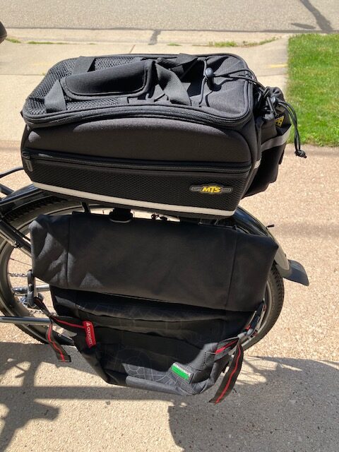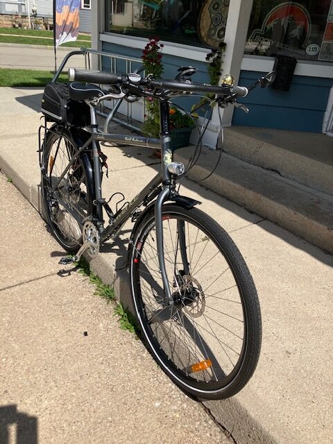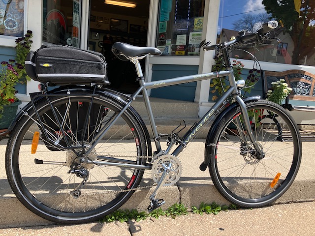 Vivente Touring Bike: Size large. This touring is bike comes fully loaded and ready for your next adventure. Fenders, rack, bags, bells, mirror, generator light set up, this bike has it all! Shimano Deore 9s drivetrain, DT wheelset, touring handlebar. This bike won’t last long at $500.